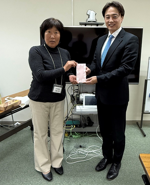 寄付を受け取る若草保育園の土屋洋子園長先生(左)